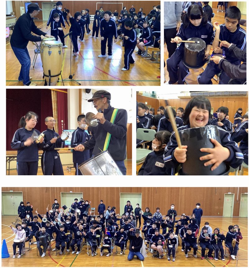 今年度は打楽器奏者の加藤ちゃぼさんをお招きして様々な打楽器を用いた交流を行いました。最初に「やってみよう」や「USA」など生徒になじみのある音楽でちゃぼさんの演奏を鑑賞しました。そのあとちゃぼさんが持ってきた大小様々な太鼓やコンガ、ボンゴ、アゴゴーなど演奏したい打楽器をみんなで選びました。